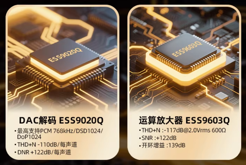 1. 核心配置拉满: 用的是ESS家的旗舰级DAC芯片~ES9020Q,搭配运放ES9603Q。这俩组合,一听就是“来真的”。